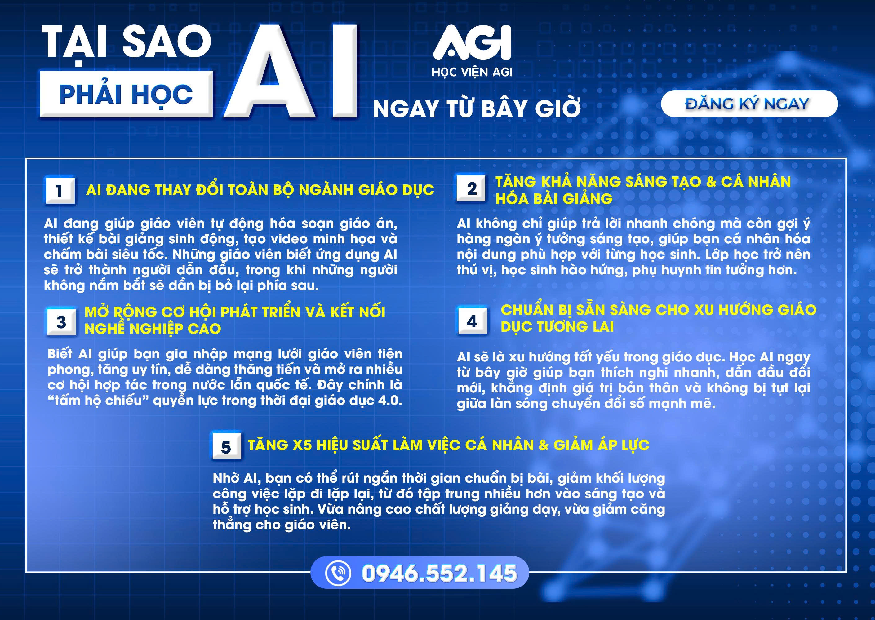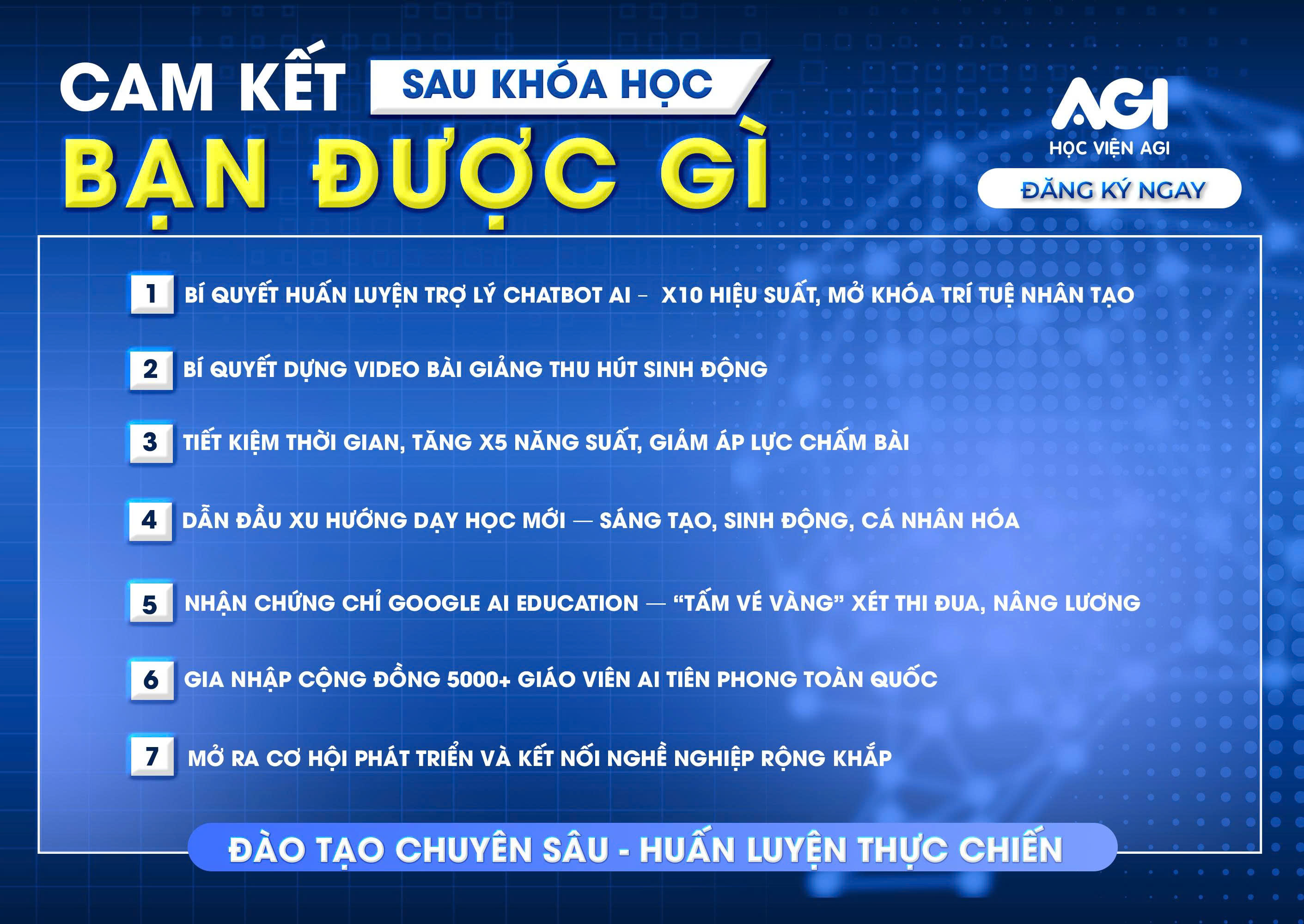 Chương trình đào tạo đặc biệt dành cho giáo viên muốn tiên phong trong thời đại chuyển đổi số – dù không rành công nghệ, không biết tiếng Anh vẫn có thể dễ dàng áp dụng AI vào bài giảng, tiết kiệm hàng giờ soạn giáo án, chấm bài và nâng cao hiệu quả giảng dạy vượt trội chỉ sau 3 buổi học trực tuyến.